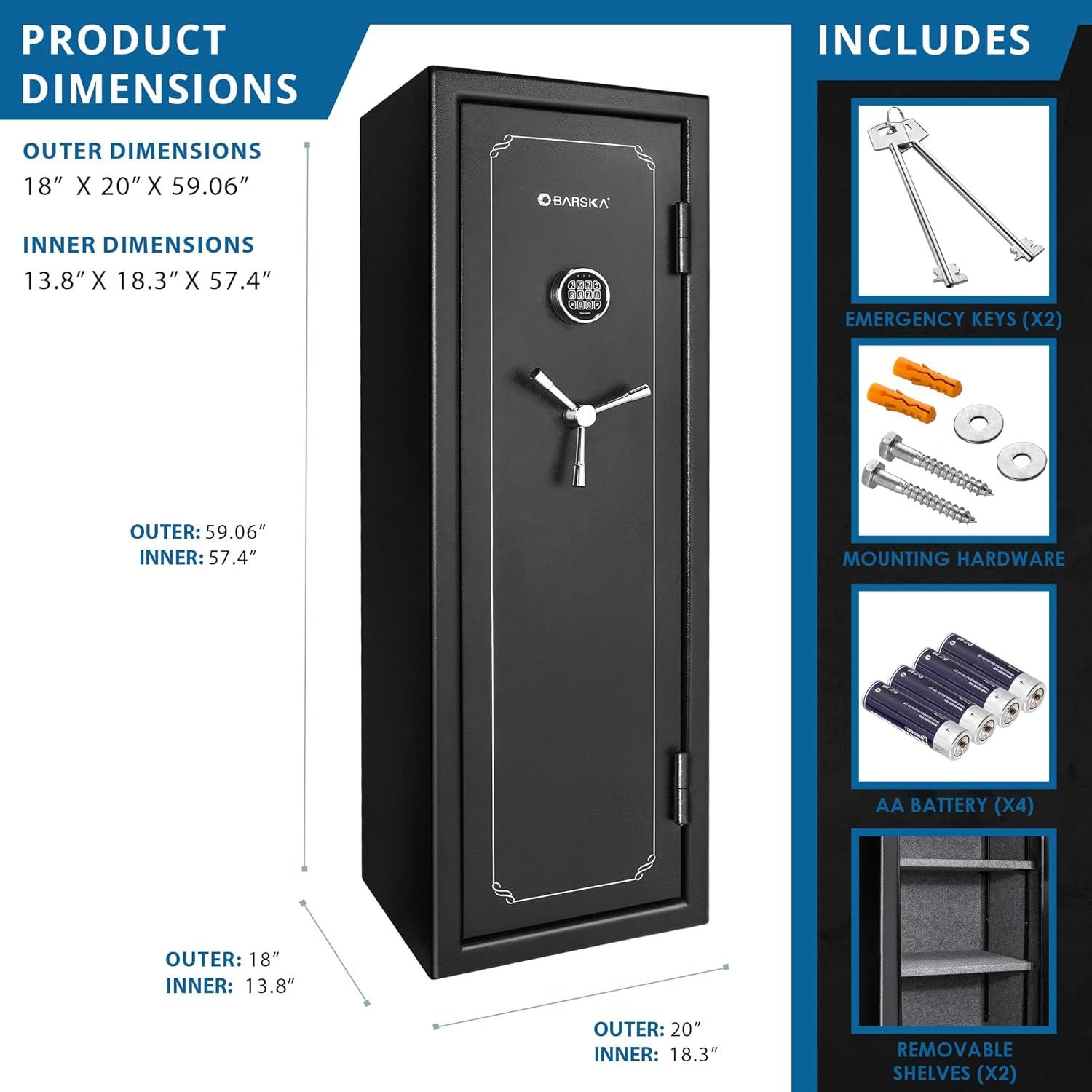 Barska FV-1000 галын хамгаалалттай бууны сэйф нь найдвартай ган бөгөөд галд тэсвэртэй гипсэн хавтантай. Barska FV-1000 сэйф нь 14 винтов буу хийх багтаамжтай. 750с-ийн хэмд 40 минут хүртэл гал тэсвэрлэх чадвартай. Энэхүү сэйф нь эд зүйлсийг хадгалах, цэгцлэх олон төрлийн тасалгаатай бөгөөд илүү зохион байгуулалттай болгохын тулд сейфийн дотоод талд байгаа тавиурыг та өөрийн хэрэгцээнд нийцүүлэн дотор талыг нь зохион байгуулах боломжтой. Мөн таны үнэт зүйлсийг эвдрэхээс хамгаалах үүднээс дотоод засал чимэглэлийг бүрээсээр бүрсэн байна.