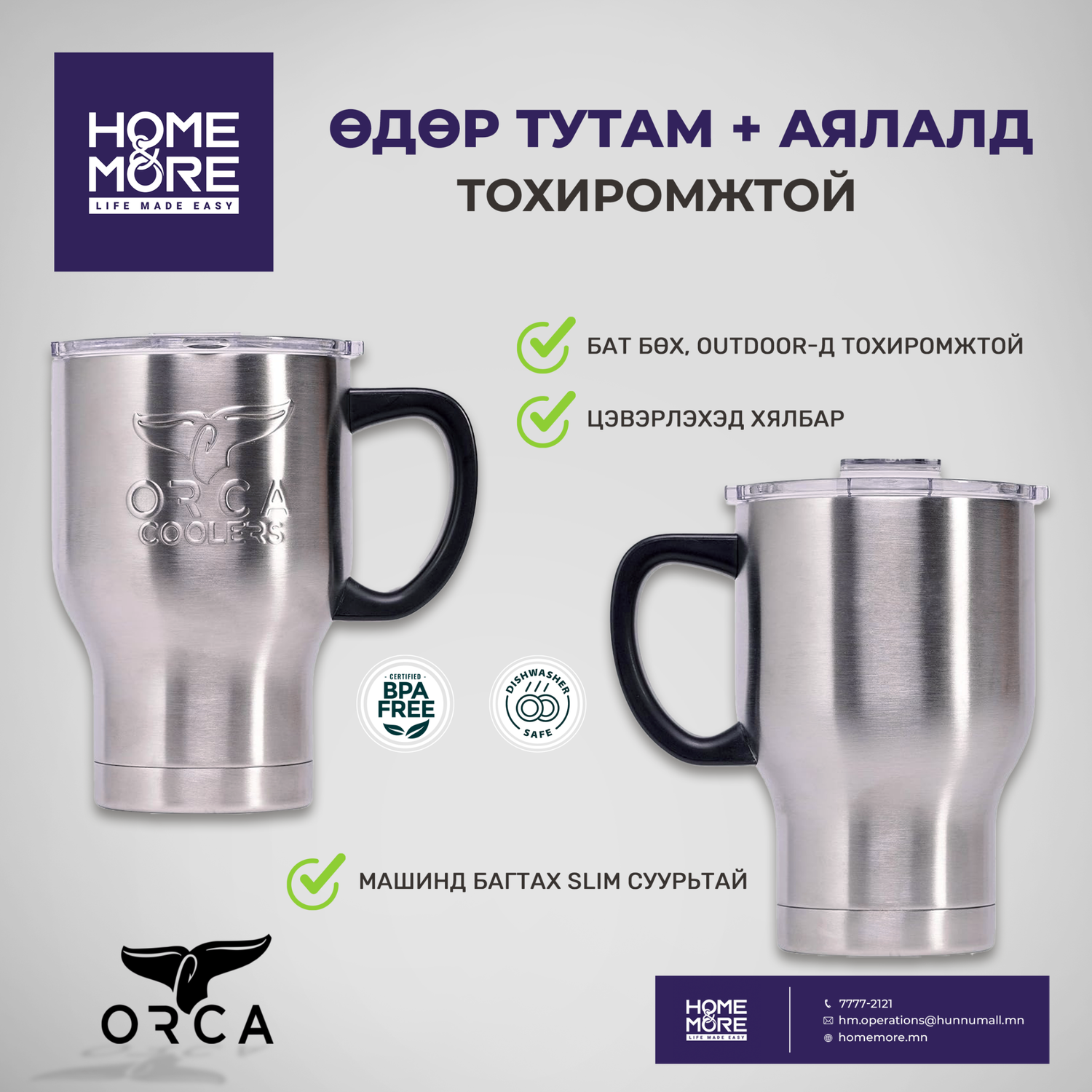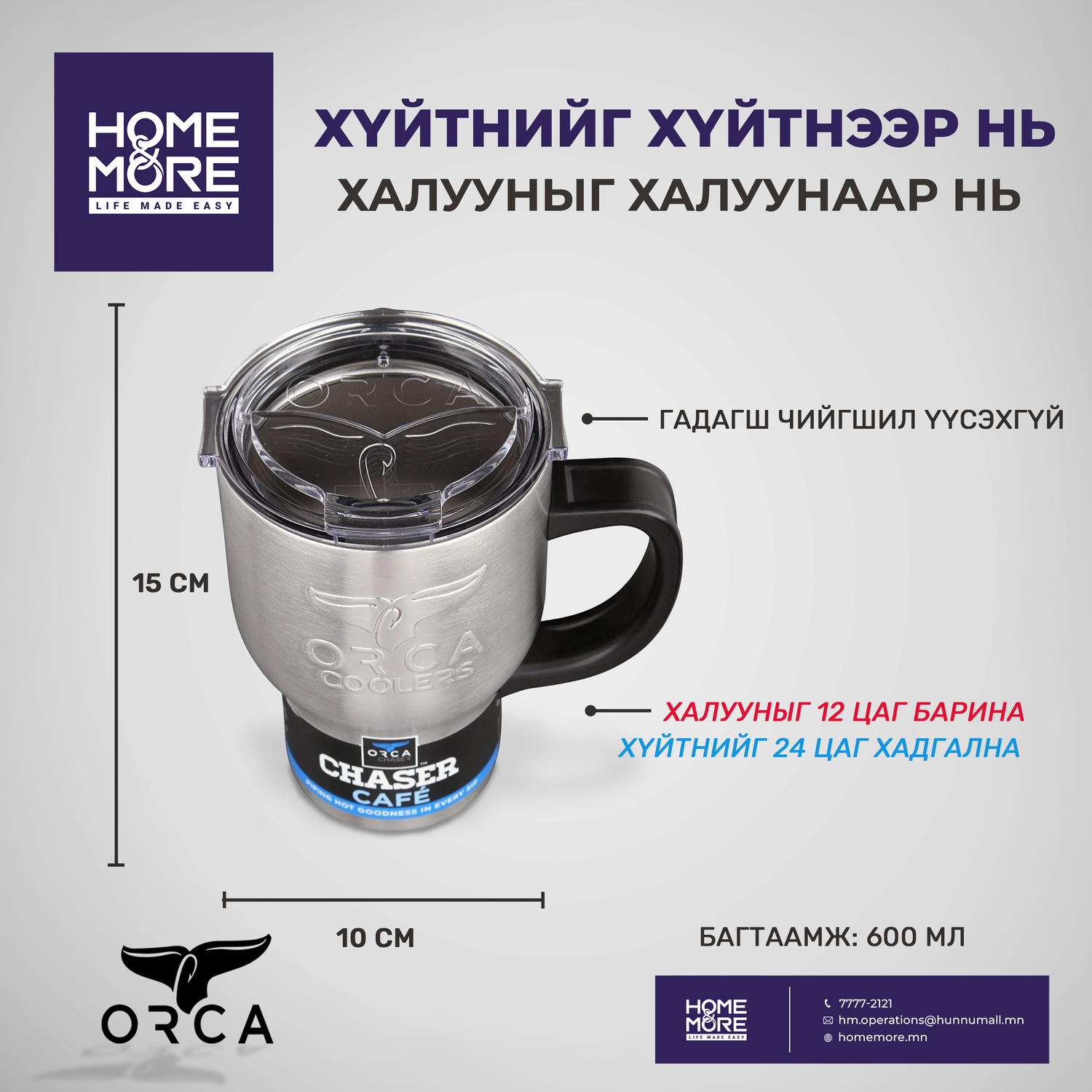 ORCA брендийн аялалын аяга нь давхар ханатай вакум битүүмжилсэн их бие, хар бариултай, BPA агуулаагүй тунгалаг тагтай, халуун шингэнийг 12 цаг хүртэл барина, хүйтэн шингэнийг 24 цаг хүртэл хүйтэн байлгана.