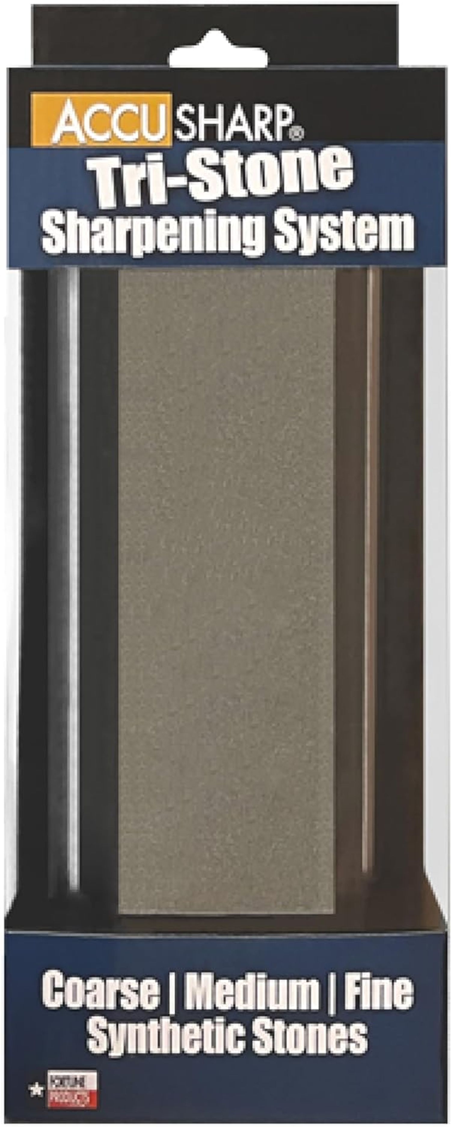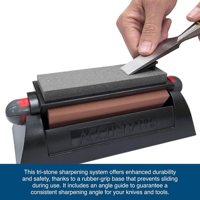 Accusharp брендийн хутга ирлэгч нь 3 чулуун гадаргуутай бөгөөд бүдүүн алмааз, дунд хөнгөн цагаан исэл, нарийн керамик гэсэн гадаргуутай.Резинэн суурьтай бөгөөд бүх төрлийн гадаргуу дээр гулсахаас сэргийлэж өгсөн.Хутганы суурь нь илүү тогтвортой байхын тулд ихэнх ширээний тавцан дээр суурилуулж болно.
