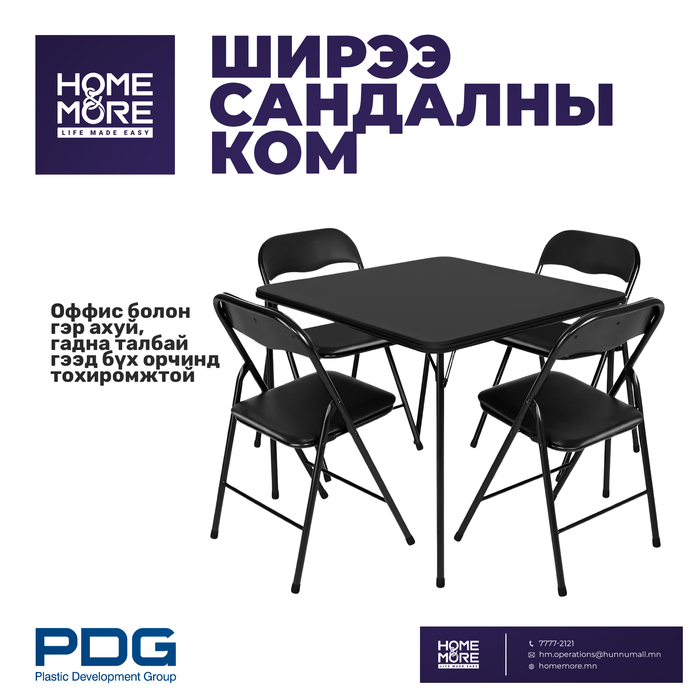 4 ширхэг сандалтай, 1 ширээтэй энэхүү ширээ сандалны ком нь задлах,болон угсрах шаардлагагүйгээр амархан эвхэгдэж хураагдана. Оффис болон гэр ахуйн зориулалтаар ашиглаж болно.